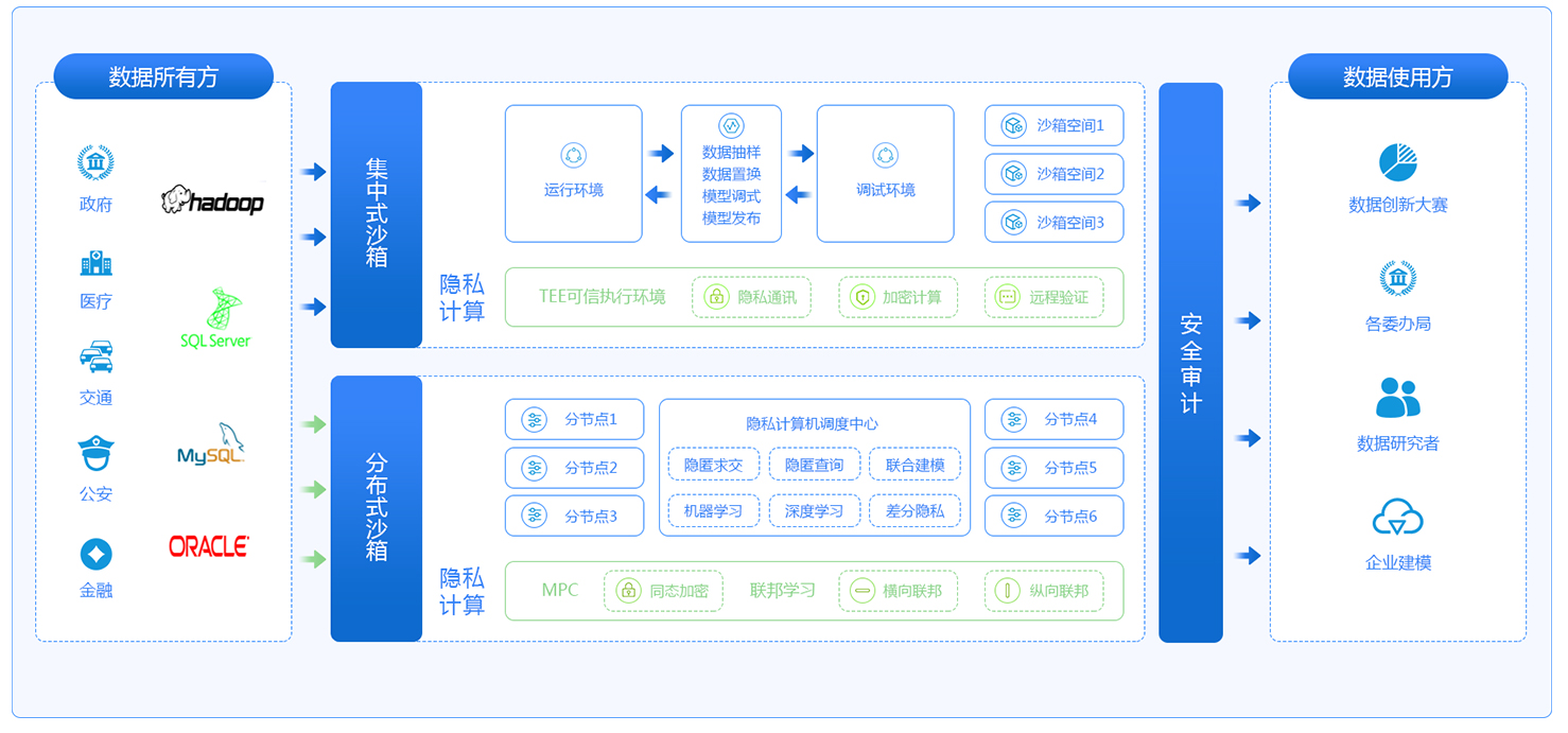 既满足部委或政府等组织数据集中且对外提供安全开放的分析计算需求,也满足金融或能源等组织数据不出域、而需要与外部数据方进行分布式的融合计算需求。